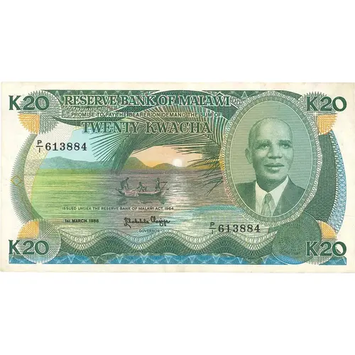 Obverse lettering THE RESERVE BANK OF MALAWI PROMISE TO PAY THE BEARER ON DEMAND THE SUM OF TWENTY KWACHA ISSUED UNDER THE RESERVE BANK OF MALAWI ACT. 1964