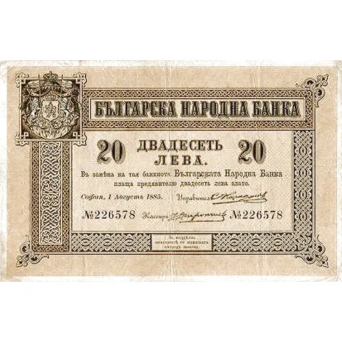 Двадесетъ Лева Българска Народна Банка Въ замѣна на тая банкнота Българската Народна Банка плаща предявителю двадесетъ лева злато София, 1 август 1885 За подправка виновнитѣ се наказватъ споредъ законъ (Translation: Twenty Leva Bulgarian National Bank In exchange of this banknote the The Bulgarian National Bank pays the bearer twenty leva gold Sofia, 1 august 1885 For forgery the guilty are punished according to the law) |