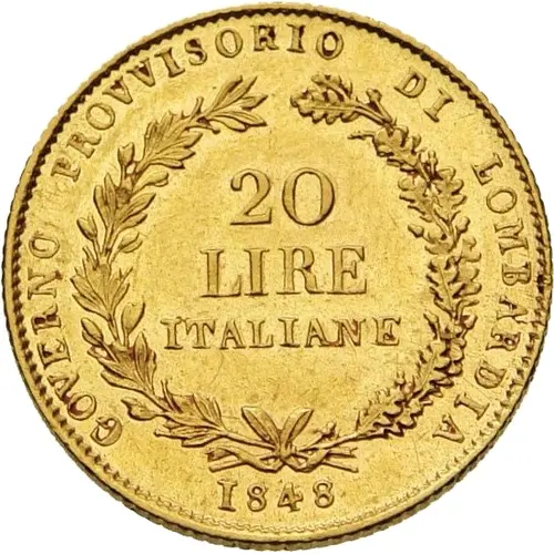 | Obverse lettering | 20 LIRE ITALIANE GOVERNO PROVVISORIO DELLA LOMBARDIA 1848 |