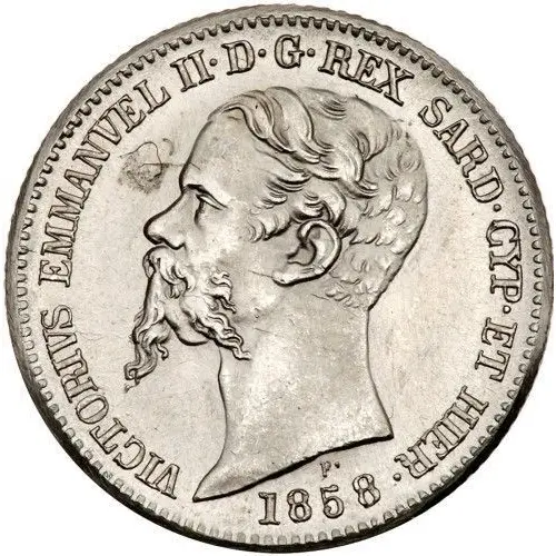 | Obverse lettering | VICTORIVS EMMANVEL II·D·G·REX SARD·CYP· ET HIER· P 1858 |