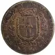 | Reverse description | Crowned spade-shaped shield of 4-fold arms, with central shield of Savoy eagle, between 2 oak branches, collar of order suspended below, value `L.20` divides mintmarks at bottom. |