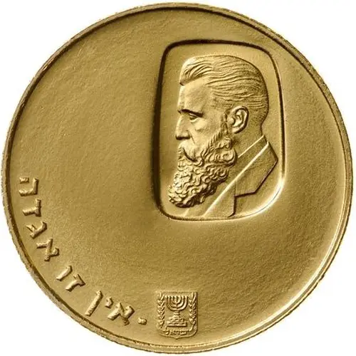 | Obverse description | In the upper right a portrayal of Theodore Herzl in an incuse rectangle with rounded corners. In the lower border, center, is the Israel State Emblem and left, in Hebrew, `It is no legend`, part of Herzl`s famous saying: `If you will it, it is no legend`. |