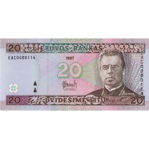 (Translation: Lithuanian Bank 1997 Lithuanian Bank Valdybos Pirmininkas Twenty Litu)