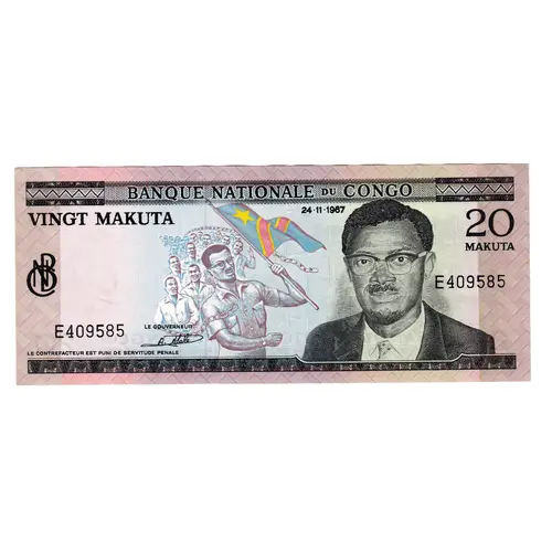BANQUE NATIONALE DU CONGO VINGT MAKUTA, 20 MAKUTA 24-11-1967 LE GOUVERNEUR LE CONTREFACTEUR EST PUNI DE SERVITUDE PENALE (Translation: Counterfeiting will be punished by law) |