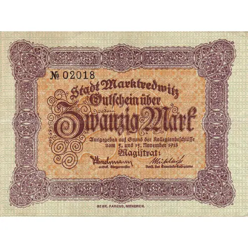 (Translation: City of Marktredwitz. Coupon of 20 Mark. Issued on the basis of the college`s resolutions from November 5th and 15th, 1918. Magistrate. Mayor.) |