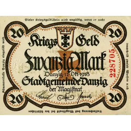 20 20 Kriegs Geld Fünf Mark Danzig · 12 · Okt · 1918 Stadtgemeinde Danzig der Magiſtrat Dieſer Kriegsgeldſchein wird ungütlig, wenn er nicht innerhalb zweier Wochen nach Aufforderung des Magiſtrats bei der ſtädtiſchen Kämmereikaſſe Danzig eingelöſt wird. 20 20 (Translation: The war money certificate becomes invalid if it is not redeemed within two weeks of the Magistrate`s request at the Gdańsk Chamber of Commerce.) |