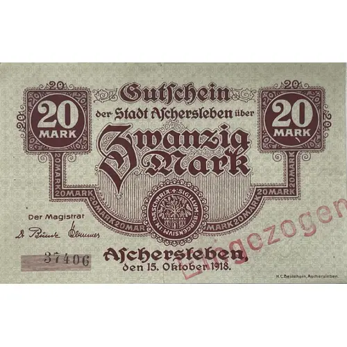Gutschein der Stadt Aschersleben über Zwanzig Mark Dieser Gutschein verliert seine Süftigfeit wenn er nicht innerhalb von vier Wochen nach in den Lageszeitungen von Aschersleben erfolgter öffentlicher Aufforderungdes Magistrats zur Einlösung bei der Stadthauptkasse zu Aschersleben eingereicht wird. (Translation: Voucher from the city of Aschersleben for twenty marks This voucher shall lose its validity if it is not submitted to the municipal treasury of Aschersleben within four weeks of the public request of the municipal authority to redeem it in the local newspapers of Aschersleben.) |