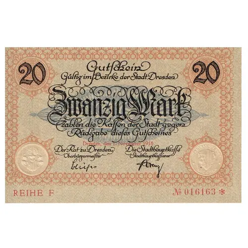 | Obverse lettering | Gutschein Gültig im Bezirke der Stadt Dresden Zwanzig Mark zahlen die Kassen der Stadt Dresden gegen Rückgabe dieses Gutscheins Dresden, den 1. November 1918 |