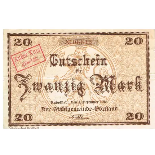 | Obverse lettering | Gutschein für Zwanzig Mark Rudolstadt, den 1. Dezember 1918 Der Stadtgemeinde-Vorstand |