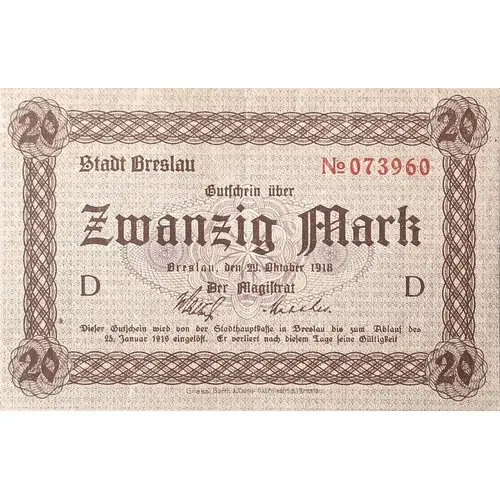 | Leyenda del anverso | Gutschein über Zwanzig Mark Breslau, den 29. Oktober 1918 Der Magistrat |