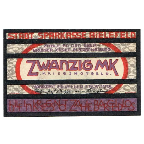 | 正面铭文 | Stadt Sparkasse Bielefeld zahle an den Über- bringer dieser Platzanweisung Zwanzig MK Kriegsnotgeld Magistrat Bielefeld 1.11.1918 |