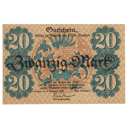 | Obverse description | Gutschein Gültig im Bezirke der Stadt Bautzen. 20 Zwanzig Mark 20 zahlen die Kassen und die Banken in der Stadt Bautzen gegen Rückgabe dieses Gutscheines. Bautzen, am 8. November 1918 |