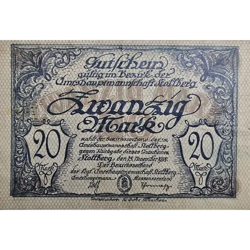 | Obverse lettering | Gutschein gültig im Bezirk der Amtshauptmannschaft Stollberg Zwanzig Mark zahlt der Bezirksverband der Amtsmannschaft Stollberg gegen Rückgabe dieses Gutscheins. Stollberg, den 15. November 1918 |