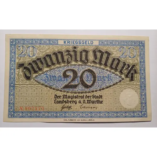 Vorderseitenlegende KRIEGSGELD ZWANZIG MARK 20 Der Magistrat der Stadt Landsberg a. d. Warthe