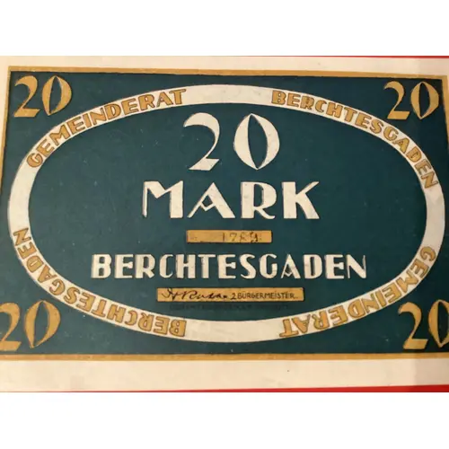 | Obverse lettering | Gemeinderat Berchtesgaden.20 MARK.Burgemeister.Value in all 4 corners.Black serial,4 dig. |