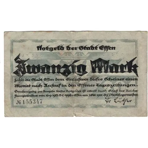 | 表面の銘文 | Notgeld der Stadt Essen Zwanzig Mark zahlt die Stadt Essen dem Einlieferer dieses Scheines einen Monat nach Aufruf in den Essener Tageszeitungen. |