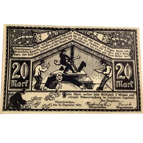 Dieses Schein verliert feine Gültigkeit 3 Wochen nach erfolgter Bekanntmachung im Lahnsteiner Tageblatt Der Magistrat Bürgermeister Beigeordneter Niederlahnstein den 10.Dezember 1922 |