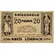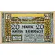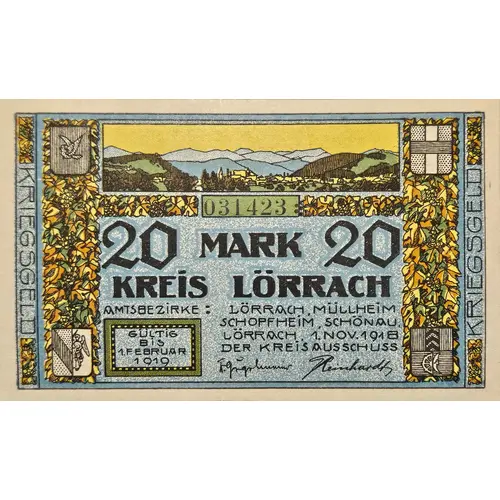 KRIEGSGELD 20 MARK 20 AMTSBEZIRKE: LORRACH, MULLHEIM, SCHOPFHEIM, SCHONAU LORRACH, 1. NOV. 1918 DER KREISMUSSCHUSS GULTIG BIS 1. FEBRUAR 1919 KREIS LORRACH (Translation: War Money 20 Mark Region: Lorrach, Mullheim, Schopfheim, Schonau Lorrach, 1. Nov. 1918 Der Kreismusschuss Valid till 1 February 1919 Region Lorrach) |
