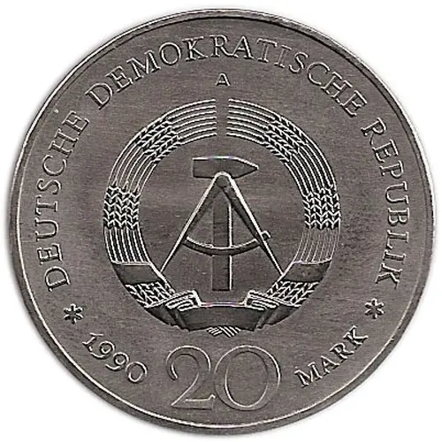 | Obverse lettering | * DEUTSCHE DEMOKRATISCHE REPUBLIK * 1990 20 MARK A |