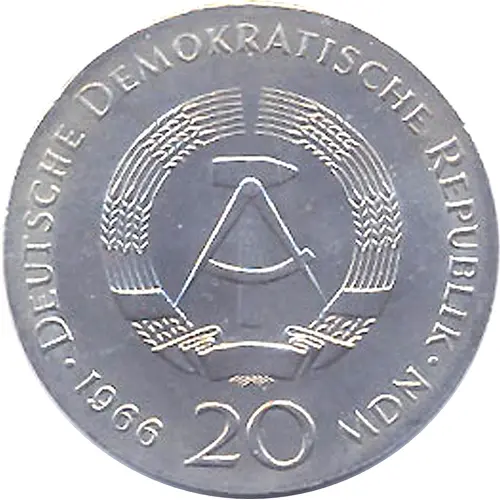 | Obverse lettering | DEUTSCHE DEMOKRATISCHE REPUBLIK 1966 20 MDN (Translation: Democratic German Republic 1966 20 Mark) |