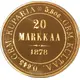 | Reverse lettering | 20 MARKKAA 1878 0,645 GRM. KUPARIA 5,806 GRM. KULTAA (Translation: 20 Marks 0,645 g copper 5,806 g gold.) |
