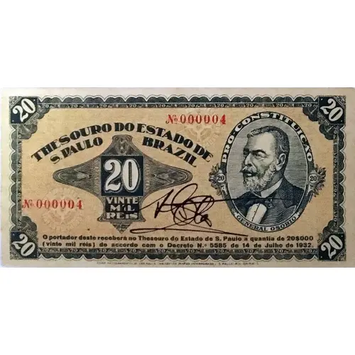 | Obverse lettering | 20 20 THESOURO DO ESTADO DE S. PAULO BRAZIL 20 VINTE MIL REIS PRÓ-CONSTITUIÇÃO 20 20 GENERAL OSORIO O portador deste receberá no Thesouro do Estado de S. Paulo a quantia de 20$000 (vinte mil réis) de accordo com o Decreto N.º 5585 de 14 de Julho de 1932. 20 20 COMP. MELHORAMENTOS DE SÃO PAULO (WEISZFLOG IRMÃOS INCORPORADA) S. PAULO - RIO - CAYEIRAS. (Translation: Treasury of the State of São Paulo. Brazil Twenty Thousand Réis Pro-Constitution General Osório The bearer of this will receive at the Treasury of the State of São Paulo the amount of 20$000 (twenty thousand réis) in accordance with Decree No. 5585 of 14 July 1932. Companhia Melhoramentos de São Paulo (Weiszflog Brothers Incorporated) São Paulo - Rio - Cayeiras.) |
