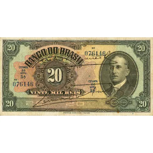| Obverse description | Black on multicolor, in calcography and lithography. 20 in the left of center. On the right of center medallion with portrait of Arthur da Silva Bernardes, 12th President of Brazil, 1922 to 1926. One or two autographs across. |