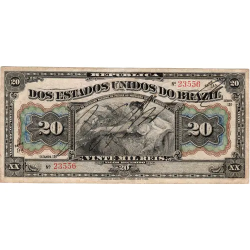 | Obverse lettering | REPUBLICA DOS ESTADOS UNIDOS DO BRAZIL NO THESOURO NACIONAL SE PAGARÁ AO PORTADOR DESTA A QUANTIA DE 20 VINTE MIL RÉIS 20 VALOR RECEBIDO 20 AMERICAN BANK NOTE CO., NEW YORK (Translation: Republic of the United States of Brazil in the National Treasury the holder will be paid the amount of 20 Twenty Thousand Reis 20 Amount Received American Bank Note Co., New York) |