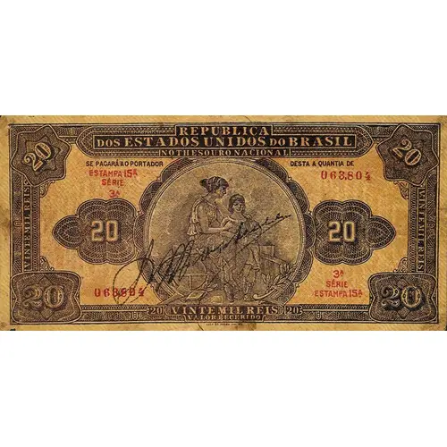 | Obverse lettering | 20 20 REPUBLICA DOS ESTADOS UNIDOS DO BRASIL NO THESOURO NACIONAL SE PAGARÁ AO PORTADOR DESTA A QUANTIA DE 20 20 VINTE MIL RÉIS VALOR RECEBIDO CASA DA MOEDA - RIO (Translation: Republic of the United States of Brazil At the National Treasury the holder will be paid the amount of Twenty Thousand Reis Amount received Casa da Moeda - Rio) |