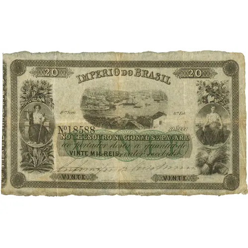 | Obverse lettering | 20 20 IMPERIO DO BRASIL NO THESOURO NACIONAL SE PAGARÁ AO PORTADOR DESTA A QUANTIA DE VINTE MIL REIS VALOR RECEBIDO VINTE VINTE (Translation: Empire of Brazil At the National Treasury you will pay bearer of this the amount of Twenty Thousand Reis Amount received Twenty) |