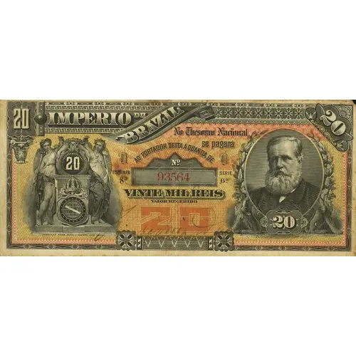 | Obverse lettering | 20 20 IMPERIO DO BRAZIL NO THESOURO NACIONAL SE PAGARÁ AO PORTADOR DESTA A QUANTIA DE VINTE MIL RÉIS VALOR RECEBIDO AMERICAN BANK NOTE COMPANY, NEW YORK (Translation: 20 Twenty Empire of Brazil At the National Treasury you will pay bearer of this the amount of Ten Thousand Réis, amount received. American Bank Note Company, New York) |
