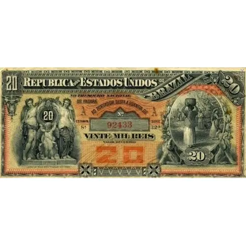 | Obverse lettering | REPUBLICA DOS ESTADOS UNIDOS DO BRAZIL NO THESOURO NACIONAL SE PAGARÁ AO PORTADOR DESTA A QUANTIA DE VINTE MIL REIS VALOR RECEBIDO 20 AMERICAN BANK NOTE CO., NEW YORK (Translation: Republic of the United States of Brazil At the National Treasury the holder will be paid the amount of Twenty Thousand Reis Amount received) |