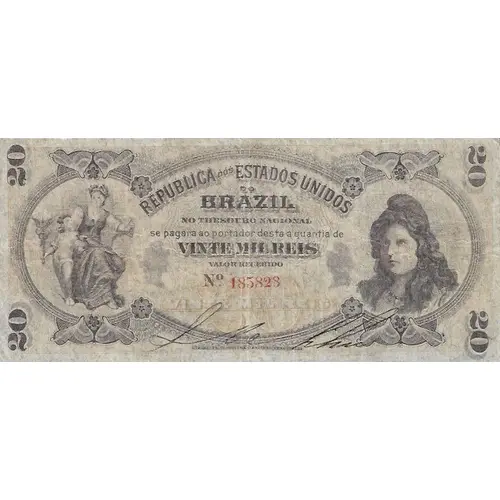 | Obverse lettering | 20 20 REPUBLICA DOS ESTADOS UNIDOS DO BRAZIL NO THESOURO NACIONAL SE PAGARÁ AO PORTADOR DESTA A QUANTIA DE VINTE MIL RÉIS VALOR RECEBIDO VINTE MIL RÉIS 20 20 (Translation: Republic of the United States of Brazil At the National Treasury the holder will be paid the amount of Twenty Thousand Reis Amount received Twenty Thousand Reis) |