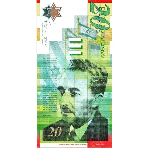 | Obverse description | Portrait of Moshe Sharett; picture of the ceremony of the unfurling of the Israeli flag at the UN building on May 12, 1949; text from the speech given by Sharett on that occasion. ; the denomination `Twenty New Sheqalim` and `Bank of Israel` in Hebrew. |