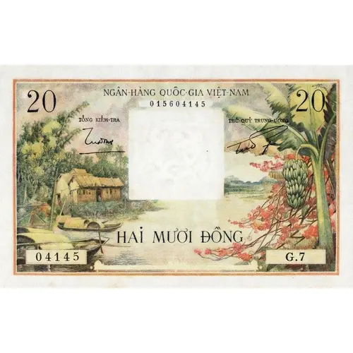 | 表面の銘文 | NGÂN-HÀNG QUỐC-GIA VIỆT-NAM 20 TỔNG KIỂM-TRA THỦ-QUỶ TRUNG ƯƠNG HAI MƯƠI ĐỒNG (Translation: National Bank of the State of Vietnam. 20. Chief Inspector. Central Cashier. Twenty đồng.) |