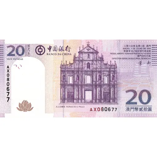 | Obverse lettering | 20 MACAU VINTE PATACAS 中國銀行 BANCO DA CHINA 二零一三年七月一日 澳門 MACAU, 1 DE JULHO DE 2013 根據第15/2013號行政法規 REGULAMENTO ADMINISTRATIVO N.ᵒ 15/2013 澳門分行行長 DIRECTOR-GERAL DA SUCURSAL DE MACAU 大三巴牌坊 RUÍNAS DE S. PAULO 澳門幣貳拾圓 (Translation: Twenty Patacas, Bank of China, 2013 July 1, According to Administrative Regulation No. 15/2013, Macau Branch President, Saint Paul`s Cathedral façade, Twenty Macanese Patacas) |