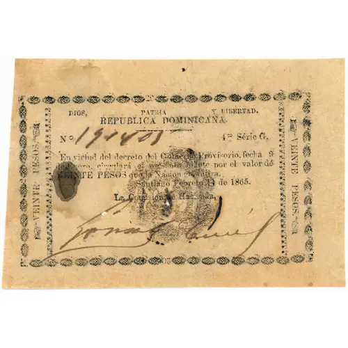 Obverse lettering DIOS, PATRIA Y LIBERTAD REPUBLICA DOMINICANA VEINTE PESOS En virtud del decreto del Gobierno Provisorio, fecha 9 de Enero, circulará el presente billete por el valor de VEINTE PESOS que la Nacion garantiza. Santiago, Febrero 14 de 1865, La Comision de Hacienda,
