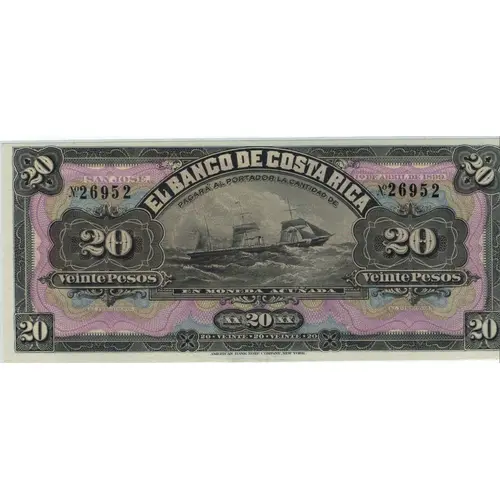 | Obverse lettering | SAN JOSE, 1º de Abril de 1899 EL BANCO DE COSTA RICA PAGARÁ AL PORTADOR LA CANTIDAD DE 20 Veinte Pesos EN MONEDA ACUÑADA xx 20 xx 20*VEINTE*20*VEINTE*20 (Translation: San Jose, 1st of April of 1899 The Bank of Costa Rica Will pay the bearer the quantity of 20 Twenty pesos In minted currency xx 20 xx 20*Twenty*20*Twenty*20) |