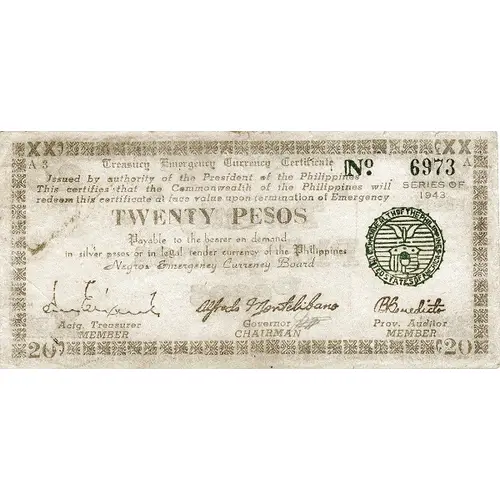 | Obverse lettering | TREASURY EMERGENCY CURRENCY CERTIFICATE ISSUED BY AUTHORITY OF THE PRESIDENT OF THE PHILIPPINES THIS CERTIFIES THAT THE COMMONWEALTH OF THE PHILIPPINES WILL REDEEM THIS CERTIFICATE AT FACE VALUE UPON TERMINATION OF EMERGENCY TWENTY PESOS PAYABLE TO THE BEARER ON DEMAND IN SILVER PESOS OR IN LEGAL TENDER CURRENCY OF THE PHILIPPINES NEGROS EMERGENCY CURRENCY BOARD |