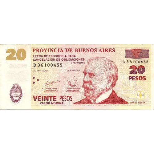 | Obverse lettering | 20 PROVINCIA DE BUENOS AIRES LETRA DE TESORERIA PARA CANCELACION DE OBLIGACIONES (PATACON) AL PORTADOR LEY Nº 12.774 20 PESOS Víctor E. Pereira Contador General de la Provincia de Buenos Aires Amílcar Zufriategui Tesorero General de la Provincia de Buenos Aires VEINTE PESOS VALOR NOMINAL DARDO ROCHA (Translation: 20 PROVINCE OF BUENOS AIRES TREASURY TITLE FOR CANCELLATION OF OBLIGATIONS (PATACON) TO THE BEARER LAW Nº 12.774 20 PESOS Víctor E. Pereira General Accountant of the Buenos Aires Province Amílcar Zufriategui General Treasurer of the Buenos Aires Province TWENTY PESOS NOMINAL VALUE DARDO ROCHA) |
