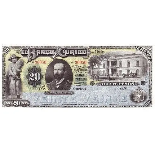 | Legenda awersu | VEINTE 20 BANCO DEL CURICO Pagara a la vista al portador en Curicó VEINTE PESOS moneda corriente. Curicó, 1882. American Bank Note Company, New York (Translation: TWENTY 20 BANCO DEL CURICO Payable on demand to the bearer in Curicó: TWENTY PESOS in current currency. Curicó, 1882. American Bank Note Company, New York) |