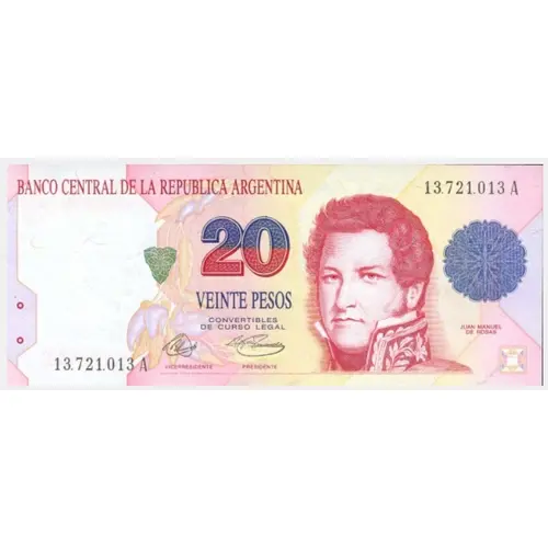 | Obverse lettering | BANCO CENTRAL DE LA REPUBLICA ARGENTINA VEINTE PESOS CONVERTIBLES DE CURSO LEGAL JUAN MANUEL DE ROSAS (Translation: Central Bank of the Argentine Republic Twenty Pesos Convertable of Legal Tender Juan Manuel de Rosas) |