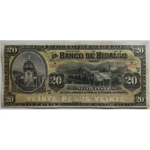 | Obverse lettering | El Banco de Hidalgo pagará veinte pesos en esta ciudad, a la vista, al portador, en efectivo. (Translation: The Banco of Hidalgo will pay twenty pesos in this city, on demand, to bearer, in cash.) |