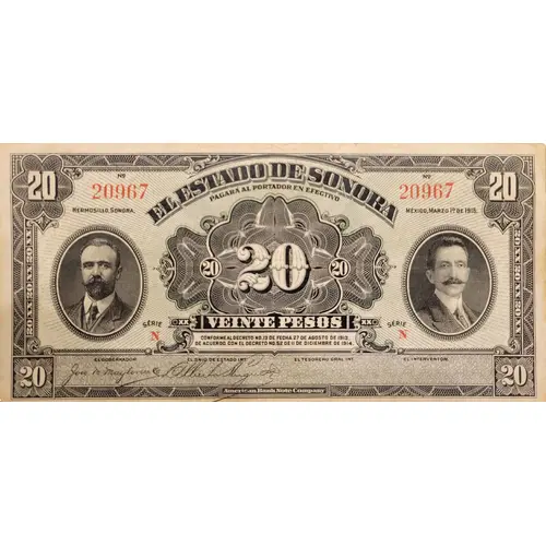 | Obverse lettering | El Estado de Sonora Pagará al Portador en Efectivo Veinte Pesos Conforme al Decreto No. 13 de fecha 27 de Agosto de 1913 de acuerde con el Decreto No. 52 de 11 de Diciembre de 1914 (Translation: The State of Sonora will pay the bearer in cash Twenty Pesos Conforming to Decree 13 dated 27 August 1913 in accordance with Decree 52 of 11 December 1914) |