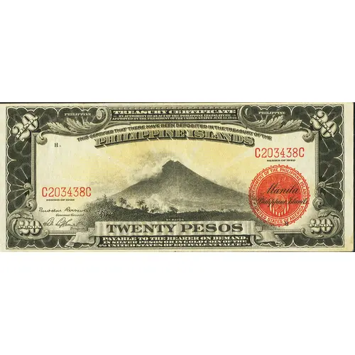 PHILIPPINE TREASURY CERTIFICATE PHILIPPINE BY AUTHORITY OF AN ACT OF THE PHILIPPINE LEGISLATURE APPROVED BY THE PRESIDENT OF THE UNITED STATES JUNE 13, 1922 THIS CERTIFIES THAT THERE HAVE BEEN DEPOSITED IN THE TREASURY OF THE PHILIPPINE ISLANDS MT. MAYON TWENTY PESOS IN SILVER PESOS OR IN GOLD COIN OF THE UNITED STATES OF EQUIVALENT VALUE |