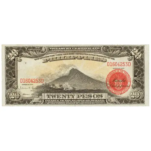 PHILIPPINES TREASURY CERTIFICATE PHILIPPINES BY AUTHORITY OF AN ACT OF THE PHILIPPINE LEGISLATURE APPROVED BY THE PRESIDENT OF THE UNITED STATES JUNE 13, 1922 THIS CERTIFIES THAT THERE HAVE BEEN DEPOSITED IN THE TREASURY OF THE PHILIPPINES MT. MAYON TWENTY PESOS PAYABLE TO THE BEARER ON DEMAND IN SILVER PESOS OR IN LEGAL TENDER CURRENCY OF THE UNITED STATES OF EQUIVALENT VALUE |