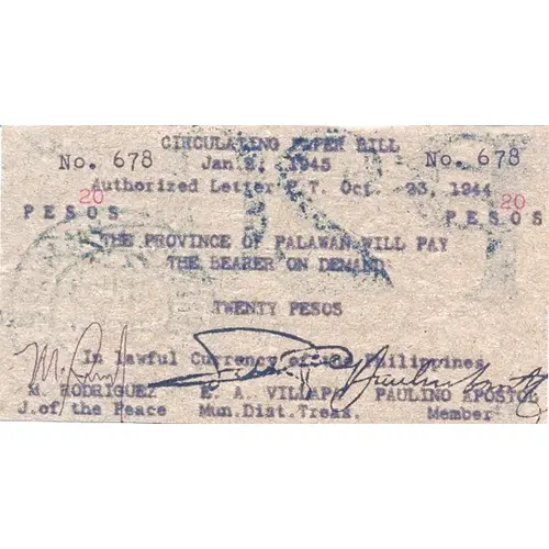 Obverse lettering CIRCULATING PAPER BILL THE PROVINCE OF PALAWAN WILL PAY THE BEARER ON DEMAND TWENTY PESOS IN LAWFUL CURRENCY OF THE PHILIPPINES