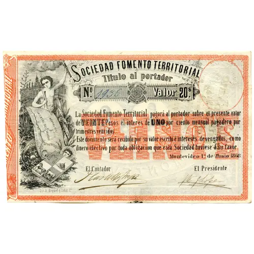 | Obverse lettering | Sociedad fomento territorial Titulo al portador Nº ____ Valor 20$ La Sociedad Fomento Territorial pagará al portador sobre el presente valor de VEINTE Pesos el interés de UNO por ciento mensual pagadero por trimestres vencidos. Este documento será recibido por su valor escrito é intereses devengados como dinero efectivo por toda obligación que esta Sociedad tuviese á su favor. Montevideo 1° de Junio 1868 A. Hequet y Cohas (Translation: Territorial Promotion Society Bearer bond. #____ Value $ 20 The Territorial Promotion Society will pay to the bearer over this value of twenty Pesos, interest of one per cent monthly, payable each overdue quarter. This document will be accepted for its face value plus interests overdue as cash money for every obligation that this Society should have on their favor. Montevideo June 1, 1868 A. Hequet & Cohas) |