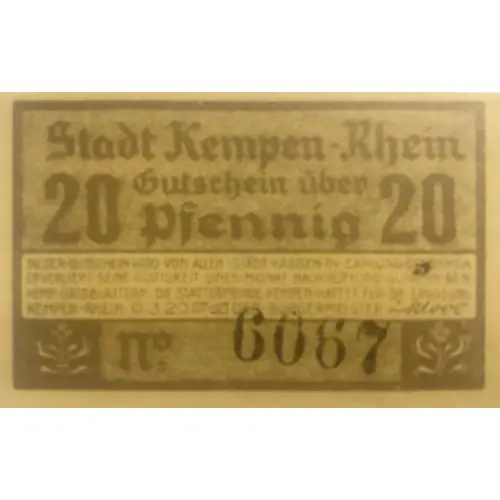 Stadt Kempen-Rhein (Gutschein über 20(2) Pfennig DIESER GUTSCHEIN WIRD VON ALLEN STADT KASSENSCHEINS IN ZAHLUNG GENOMMEN ER VERLIERT SEINE GÜLTIGKEIT EINEN MONAT NACH AUFKÜNDIGUNG IN DEN KEMP.ORSTBLÄTTERN.DIE STADTGEMEINDE KEMPEN HAFTET FÜR DIE EINLÖSUNG. KEMPEN-RHEIN 9.3.20 DER BÜRGERMEISTER |