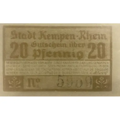 Obverse lettering Stadt Kempen-Rhein Gutschein über 20(2) Pfennig DIESER GUTSCHEIN WIRD VON ALLEN STADT KASSENSCHEINS IN ZAHLUNG GENOMMEN ER VERLIERT SEINE GÜLTIGKEIT EINEN MONAT NACH AUFKÜNDIGUNG IN DEN KEMP.ORSTBLÄTTERN.DIE STADTGEMEINDE KEMPEN HAFTET FÜR DIE EINLÖSUNG. KEMPEN-RHEIN 9.3.20 DER BÜRGERMEISTER